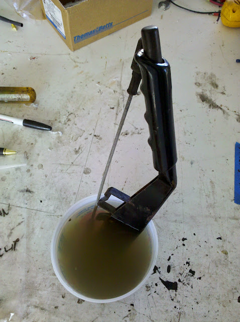 I decided to start by attacking the emergency brake handle. It was a chipped paint and rusty mess. I soaked it in the magic fluid, then sanded, primed, painted and clear coated.